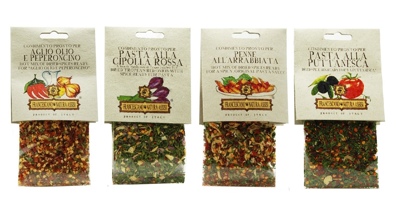 Peperoncino intero, Peperoncino frantumato, Carbonara bianca, Amatriciana, Cacio e pepe, Arrabbiata, Aglio olio e peperoncino, Puttanesca, Asparagi mandorle e pistacchi, Ortolana, Spaghettata italiana, Cipolla rossa, Bruschetta piccante - GR 100